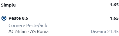 Până acum, AC Milan a înregistrat o medie de 4,90 cornere obținute pe partidă, în timp ce AS Roma se descurcă chiar mai bine la acest capitol, având o medie de circa 6,20 cornere obținute per meci.