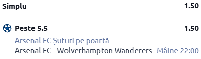 Astăzi avem parte de foarte multe partide interesante, iar în primă fază, mergem pe Emirates Stadium, acolo unde Arsenal urmează să primească vizita celor de la Wolves. Pontul meu este în cotă 1.50!