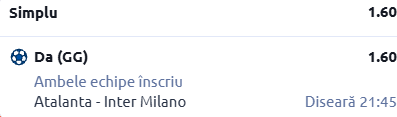 Mergem și în Serie A, acolo unde mi-a atras atenția confruntarea dintre Atalanta - Inter. În rândurile de mai jos ți-am pregătit analiza completă a meciului, cât și un pont în cotă 1.60!