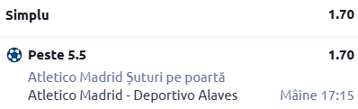 Am să merg destul de simplu la această partidă. Mizăm mai exact pe linia de peste 5,5 șuturi pe poartă trimise de Atletico. Mi se pare cel mai potrivit pariu pentru acest joc.