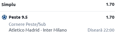 Atletico înregistrează per total o medie de 5,30 cornere obținute per meci, în timp ce trupa pregătită de Cristi Chivu are cifre chiar mai solide, obținând minim 6,10 cornere pe partidă.
