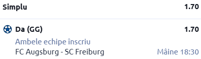 Mergem mai întâi în primul eșalon de fotbal german - Bundesliga, acolo unde Augsburg urmează să primească vizita celor de la Freiburg. În rândurile de mai jos găsești informații esențiale despre cele două grupări, cât și un pont în cotă 1.70!
