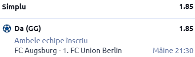 Mergem mai întâi în primul eșalon de fotbal german - Bundesliga, acolo unde Augsburg urmează să primească vizita celor de la Union Berlin. În rândurile de mai jos găsești informații esențiale despre cele două grupări, cât și un pont în cotă 1.85!