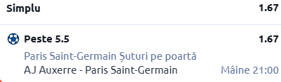 Am să merg destul de simplu la această partidă. Mizăm mai exact pe linia de peste 5,5 șuturi pe poartă trimise de PSG. Mi se pare cel mai potrivit pariu pentru acest joc.