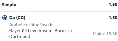 Facem o vizită și pe BayArena, acolo unde Bayern Leverkusen urmează să primească vizita celor de la Borussia Dortmund. În rândurile de mai jos găsești informații despre cele două echipe, cât și un pont în cotă 1.50!