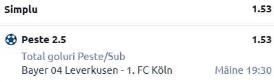 Avem deci în față două echipe care obișnuiesc să marcheze constant, dar care în același timp, au defensive foarte slabe. Leverkusen este clar favorită astăzi, dar nu exclud să primească minim un gol de la Koln.