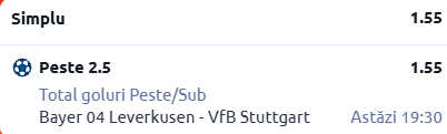 Avem deci în față două cu un apetit ofensiv foarte ridicat. Leverkusen pornește cu prima șansă, dar nu exclus să vedem o eventuală surpriză. Poate par puțin sărit de pe fix, dar nu aș fi deloc mirat dacă cei de la Stuttgart ar marca chiar minim două goluri astăzi.