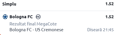 Prima recomandare de astăzi și totodată đin această lună, vine de la confruntarea dintre Bologna FC - Cremonese. Partida are loc pe Stadio Renato Dall’Ara, începând cu ora 21:45!