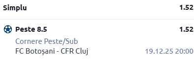 Botoșani are o medie generală de aproximativ 5 cornere înregistrate pe partidă. Clujenii se descurcă la fel de bine la acest capitol.