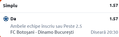 Mergem și pe plaiurile noastre, acolo unde mi-a atras atenția disputa dintre FC Botoșani - Dinamo București, duel din cadrul etapei cu numărul 17 din Super Liga. Pontul meu este în cotă 1.57!