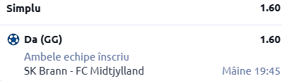Încheiem lista de ponturi cu prefațarea confruntării dintre Brann - Midtjylland. Găsești mai jos informații despre cele două protagoniste din acest joc, cât și un pont în cotă 1.60!