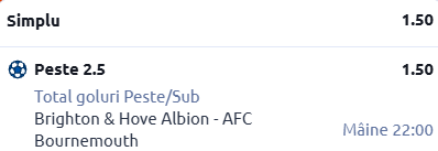 Mergem mai întâi pe Amex Stadium, acolo unde Brighton urmează să primească vizita celor de la Bournemouth. În rândurile de mai jos găsești informațiile necesare pentru acest duel, cât și un pont în cotă 1.50!