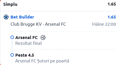 Facem o vizită și pe Jan Breydel Stadion, acolo unde Club Brugge urmează să primească vizita tunarilor de la Arsenal. Pronosticul meu se bazează pe un combo, la o cotă de 1.65!