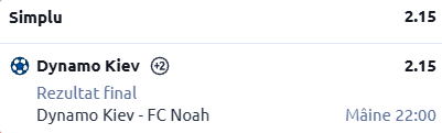 Avem seară de Conference League, iar prima vizită o facem la disputa dintre Dynamo Kiev vs FC Noah. În rândurile de mai jos ți-am pregătit analiza completă a partidei, cât și un pont în cotă 2.15!