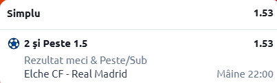 Facem o vizită și pe Estadio Manuel Martínez Valero, acolo unde Elche urmează să primească vizita celor de la Real Madrid. În rândurile de mai jos îți sunt prezentate detalii despre cele două formații, cât și un pont în cotă 1.53!