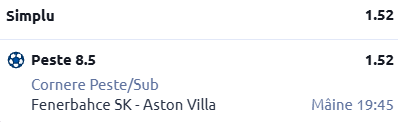 Mergem și pe Sukru Saracoglu, acolo unde, începând cu ora 19:45, avem programată confruntarea dintre Fenerbahce - Aston Villa, meci din cadrul grupei de Europa League. Pontul meu este în cotă 1.52!