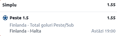 Prefațăm mai întâi disputa de pe Helsinki Olympic Stadium, acolo unde Finlanda urmează să primească vizita selecționatei din Malta. Pronosticul meu este în cotă de 1.55!
