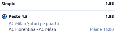 Am să merg destul de simplu la această partidă. Mizăm mai exact pe linia de peste 4,5 șuturi pe poartă trimise de AC Milan. Mi se pare cel mai potrivit pariu pentru acest joc.
