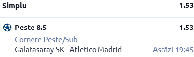La cornere, am o oarecare siguranță, deoarece cele două dezvoltă foarte mult atacurile prin extreme, Galata având o medie generală de 6,40 cornere obținute per meci, iar Atletico reușește să completeze cu o medie de 5,20 cornere.