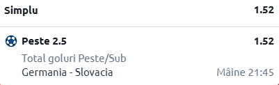 Ultima vizită o facem la disputa dintre Germania - Slovacia, meci ce se va juca cu calificarea pe masă. În rândurile de mai jos îți sunt prezentate informații despre cele două echipe, cât și un pont în cotă 1.52!