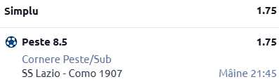 Ultima recomandare de astăzi vine de pe Stadio Olimpico, din Roma, acolo unde, începând cu ora 21:45, avem programată confruntarea dintre Lazio - Como. Pontul meu este în cotă 1.75!