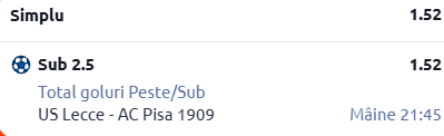 Mergem și în primul eșalon de fotbal italian, acolo unde Lecce urmează să primească vizita celor de la Pisa. Mă aștept la un duel închis, cu puține realizări pe tabelă, așa că mizăm în consecință. Pontul meu este în cotă 1.52!