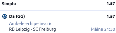 Facem mai întâi o vizită pe Red Bull Arena, acolo unde Leipzig urmează să primească vizita celor de la Freiburg. În rândurile de mai jos găsești informații esențiale despre cele două grupări, cât și un pont în cotă 1.57!