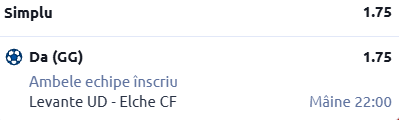 Mergem și în primul eșalon de fotbal spaniol - La Liga, acolo unde Levante urmează să primească vizita celor de la Elche. În rândurile de mai jos găsești informații esențiale despre cele două grupări, cât și un pont în cotă 1.75!