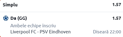 Trecând la pronosticul propus, Liverpool este o formație care marchează constant, dar apărarea este bulevard, iar olandezii de la PSV știu exact cum să profite la maxim de acest aspect. Varianta “safe” merge pe GG.