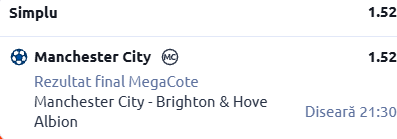 Facem o vizită și pe Etihad Stadium, acolo unde Manchester City urmează să primească vizita celor de la Brighton. În rândurile de mai jos îți sunt prezentate informații despre cele două, cât și un pont în cotă în 1.52!