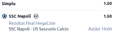 Ultima recomandare de astăzi vine de pe Stadio Diego Armando Maradona, acolo unde Napoli urmează să primească vizita celor de la Sassuolo. În rândurile de mai jos găsești informații despre cele două echipe, cât și un pont în cotă 1.50!