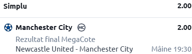 Facem o vizită și pe St. James’ Park, acolo unde Newcastle United urmează să primească vizita celor de la Manchester City. În rândurile de mai jos îți sunt prezentate informații despre cele două formații, cât și un pont în cotă 2.00!