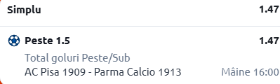 Mergem și în primul eșalon de fotbal italian, acolo unde Pisa urmează să primească vizita celor de la Parma. Mă aștept la un duel spectaculos, așa că mizăm în consecință. Pontul meu este în cotă 1.47!