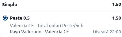 Facem o vizită și pe Campo de Futbol de Vallecas, acolo unde avem programată confruntarea dintre Rayo Vallecano - Valencia. În rândurile de mai jos îți sunt prezentate informații despre cele două, cât și un pont în cotă 1.50!
