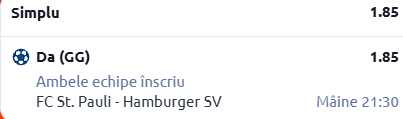 Facem o vizită și pe Millerntor Stadion, acolo unde St Pauli urmează să primească vizita celor de la Hamburger, într-un meci ce contează pentru etapa cu numărul 19 din Bundesliga. Pontul meu este în cotă 1.85!