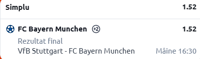 Mergem și în primul eșalon de fotbal german - Bundesliga, acolo unde mi-a atras atenția confruntarea dintre Stuttgart - Bayern Munchen. Pronosticul meu este în cotă 1.52!