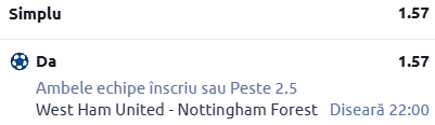 Prima recomandare de astăzi vine de pe London Stadium, acolo unde West Ham vs Nothingham Forest urmează să se întâlnească în etapa cu numărul 21 din Premier League. Pontul meu este în cotă 1.57!