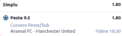 Prima recomandare de astăzi vine de pe Emirates Stadium, acolo unde, începând cu ora 18:30, avem programată confruntarea dintre Arsenal - Manchester United. Pontul meu este în cotă 1.80!