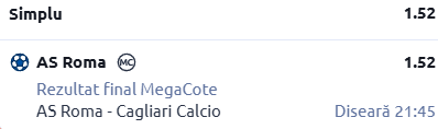 La partida de astăzi, eu am să merg direct pe victoria gazdelor. Roma este echipa net superioară, chit că nici Cagliari nu este o echipă ușoară. Cum am spus, are 3 victorii consecutive.
