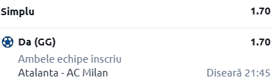 Tot astăzi, avem programată și întâlnirea dintre Atalanta - AC Milan, dispută din cadrul etapei cu numărul 9 din Serie A. Ne bazăm pe simplitate, iar pontul meu este în cotă 1.70!