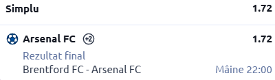 Mergem mai întâi pe Community Stadium, acolo unde Brentford urmează să primească vizita celor de la Arsenal. În rândurile de mai jos îți sunt prezentate informații despre cele două, cât și un pont în cotă în 1.72!