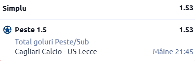 Mergem mai întâi pe Unipol Domus, acolo unde Cagliari urmează să primească vizita celor de la Lecce. În rândurile de mai jos găsești informațiile necesare pentru acest duel, cât și un pont în cotă 1.53!