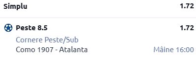 Ultima recomandare de astăzi vine de pe Stadio Giuseppe Sinigaglia, acolo unde, începând cu ora 16:00, avem programată confruntarea dintre Como - Atalanta. Pontul meu este în cotă 1.72!