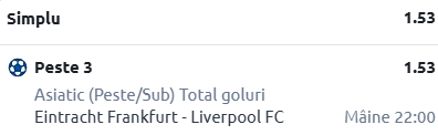 În această etapă, avem și un super duel, cel de pe Deutsche Bank Park, acolo unde Eintracht Frankfurt urmează să primească vizita celor de la FC Liverpool. Eu am să mizez pe un pronostic în cotă 1.53!