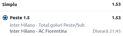 Unul dintre cele mai interesante dueluri din această seară este fără dar și poate cel dintre Inter - Fiorentina, meci ce contează pentru etapa cu numărul 9 din Serie A. Pontul meu este în cotă 1.53!