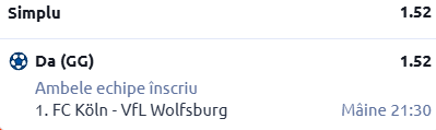 Mergem mai întâi în primul eșalon de fotbal german - Bundesliga, acolo unde Koln urmează să primească vizita celor de la Wolfsburg. În rândurile de mai jos găsești informații esențiale despre cele două grupări, cât și un pont în cotă 1.52!