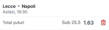 Napoli nu este în schimb nici ea o formație care să atace în valuri. Spre exemplu, în 4 din ultimele 5 dispute, aceasta a înregistrat maxim 12 șuturi. Și acum vine “cheia” care oferă liniei propuse statusul de linie value.