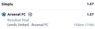 Mergem mai întâi pe Elland Road, acolo unde Leeds urmează să primească vizita celor de la Arsenal. În rândurile de mai jos îți sunt prezentate informații despre cele două, cât și un pont în cotă în 1.57!
