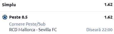 Facem o vizită și pe Estadi Mallorca Son Moix, acolo unde Mallorca urmează să primească vizita celor de la Sevilla. În rândurile de mai jos îți sunt prezentate informații despre cele două echipe, cât și un pont în cotă 1.62!