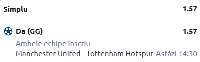 Mergem mai întâi pe Old Trafford, acolo unde United urmează să primească vizita celor de la Spurs, într-un meci ce contează pentru etapa cu numărul 25 din Premier League. Pontul meu este în cotă 1.57!